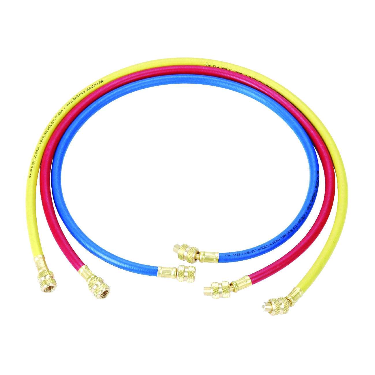 3 заправочных шланга(красный, желтый, синий) длинна 36"(90см), для хладогента R12, R22, R502, рабочее давление 500 PSI